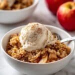 A white bowl holds a warm apple crisp dessert with a crumbly, golden-brown layer of baked cinnamon apple chunks at the bottom. On top, there is a smooth, creamy scoop of vanilla ice cream that is beginning to melt slightly, with a light dusting of cinnamon powder visible on the ice cream’s surface. The bowl sits on a white marbled background. In the blurred background, there are two red apples and another white bowl with the same dessert. photo taken with an iphone --ar 4:5 --v 7