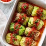 Store leftover stuffed cabbage rolls in an airtight container in the refrigerator for up to 3 days. To reheat, warm gently in the oven or microwave until heated through. They also freeze well—wrap individually or store in a freezer-safe container for up to 3 months. Thaw overnight in the refrigerator before reheating.
