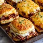 This image shows several sandwiches in a baking tray on a white marbled surface. Each sandwich has three visible layers: the bottom layer is a golden-brown biscuit with a soft texture, the middle layer contains shredded, juicy beef with a reddish-brown color, and the top layer is a thick golden-brown melted cheese that looks bubbly and creamy, sprinkled with finely chopped green herbs. The sandwiches have a slightly crispy and rich look with melted cheese oozing on the sides. Photo taken with an iphone --ar 4:5 --v 7