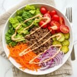 Keywords: Big Mac Salad, Cheeseburger Salad, Low Carb Salad, Ground Beef Salad, Copycat McDonald’s Big Mac