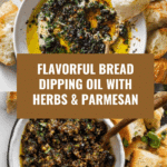 This Bread Dipping Oil is a flavorful and aromatic dip perfect for serving with warm, crusty bread. Combining fresh herbs, olives, garlic, and parmesan, it delivers a delightful Mediterranean taste that is sure to impress your guests or elevate any meal.