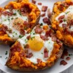 PrintBreakfast Sweet Potato Boats with Bacon, Cheddar, and Egg Recipe