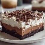 The image shows a square layered dessert on a white plate, placed on a white marbled surface. The bottom layer is a dark, crumbly chocolate crust, thick and solid. Above it is a smooth, medium brown chocolate pudding layer, thick and creamy. Next is a white whipped cream layer, fluffy and slightly thick with soft swirls around the edges. The top is covered with many irregular dark chocolate shavings scattered evenly, adding texture and a rich look. A blurred drink glass is in the background. photo taken with an iphone --ar 4:5 --v 7