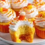 - Frost and Decorate: Transfer the frosting to a piping bag fitted with a large tip. Pipe the marshmallow buttercream generously on top of each cooled cupcake. Decorate with candy corn pieces and sprinkle with orange and yellow sprinkles for a festive finishing touch. Serve and enjoy!