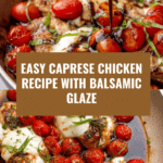 This Caprese Chicken recipe is a vibrant Italian-inspired dish featuring juicy seared chicken breasts topped with fresh mozzarella, sweet grape tomatoes, and a rich balsamic glaze. Baked to perfection and garnished with fresh basil, it combines savory, tangy, and fresh flavors in an easy-to-make skillet meal ideal for weeknight dinners or special occasions.