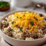 This Cheesy Hamburger Rice Casserole is a hearty and comforting dish, combining flavorful ground beef, tender rice, savory mushroom soup, and melted cheddar cheese. Perfect for a satisfying family dinner, it features a simple stovetop preparation followed by baking for a rich, cheesy finish.