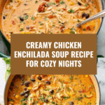 Chicken Enchilada Soup is a comforting and flavorful dish that combines the best of classic enchilada flavors in a warm, hearty soup. Perfect for a cozy dinner, it’s packed with tender chicken, beans, corn, and a creamy cheesy finish.