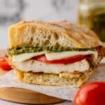 Keywords: Chicken sandwich, pesto sandwich, caprese sandwich, Italian sandwich, grilled chicken, mozzarella, pesto, ciabatta rolls