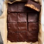 Delicious and simple no bake chocolate peanut butter bars made with natural peanut butter, gluten-free oat or almond flour, and sweetened with maple syrup. These bars are perfect for a quick snack or dessert, featuring a creamy peanut butter base topped with a rich chocolate layer. No baking required – just a bit of stove top heating and chilling to set.