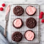 Keywords: chocolate cookies, raspberry frosting, sandwich cookies, cream cheese frosting, homemade cookies, dessert recipe