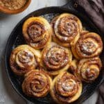 Seven golden-brown cinnamon rolls, each with multiple visible layers twisted into a spiral shape, are arranged in a circle on a black cast-iron skillet. The rolls have a lightly crispy and caramelized outer texture with a dusting of fine white powdered sugar that adds a soft snowy effect. The skillet’s texture is rough with a matte finish, and part of the handle with the number 8 is visible, resting on a white marbled surface. To the left, there is a small wooden bowl filled with brown sugar, partially visible. Some sugar granules are scattered lightly across the surface and the skillet, enhancing the cozy, homemade feel. Photo taken with an iphone --ar 4:5 --v 7