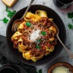 This classic Bolognese sauce is a rich and hearty Italian meat sauce made with ground beef and pork, sautéed vegetables, pancetta, tomatoes, wine, and milk, slow-simmered to develop deep flavors. Finished with cream, Parmesan cheese, and fresh parsley, it pairs perfectly with wide pasta such as tagliatelle or pappardelle.