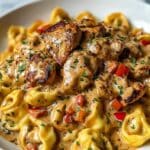 Cowboy Butter Garlic Chicken Tortellini is a creamy, flavorful pasta dish combining tender chicken seasoned with smoked paprika and garlic, a rich buttery sauce infused with garlic, lemon, and spices, and fire-roasted red peppers for a smoky kick. This hearty meal is finished with Parmesan cheese and fresh parsley, perfect for a satisfying weeknight dinner.