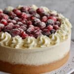 - Top Cheesecake with Mousse and Decorate: Spread the white chocolate mousse evenly over the top of the chilled cheesecake. If desired, pipe some mousse decoratively using a frosting tip. Arrange candied cranberries on top of the mousse for garnish and additional flavor.