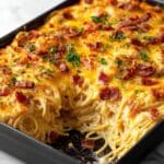 This Creamy Southern Spaghetti Bake is a comforting casserole combining tender spaghetti with shredded chicken, rich cream cheese, creamy soup, and tangy ranch seasoning. Topped with melted cheddar, crispy bacon, and a sprinkle of Parmesan, it’s a hearty, flavorful dish perfect for family dinners or potlucks.