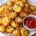 A close-up view of a white plate filled with small, golden-brown potato bites that have a crispy texture and are sprinkled with grated cheese and small green herb pieces. The potato bites are piled high and appear hot and fresh. On the right side of the plate is a white bowl filled with red dipping sauce, adding a bright contrast to the warm colors of the potatoes. The whole setup sits on a white marbled surface. photo taken with an iphone --ar 4:5 --v 7