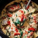 This Crockpot Tuscan Chicken recipe features tender chicken thighs simmered in a creamy, flavorful sauce made with garlic, heavy cream, chicken broth, parmesan cheese, sun-dried tomatoes, and spinach. Perfectly seasoned with Italian herbs and a touch of red chili flakes, this dish is rich and comforting, ideal for an easy, hands-off meal prepared in your slow cooker.