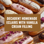 This classic Eclairs recipe features perfectly baked choux pastry filled with creamy vanilla pastry cream and finished with luscious dark, white, and pink chocolate glazes. The eclairs are elegantly decorated with edible rose petals, gold leaf flakes, and gold sprinkles, creating a stunning and indulgent dessert perfect for special occasions or an upscale treat.