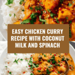 This Easy Chicken Curry is a flavorful and comforting dish made with tender chicken breasts simmered in a rich and aromatic coconut milk-based sauce, enhanced with a blend of mild curry spices. Perfect for a weeknight dinner, it comes together quickly using simple ingredients and is topped with fresh coriander and baby spinach for a vibrant finish.