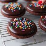 - Decorate Cookies: Spoon about 1 tablespoon of ganache onto the center of each cooled cookie and sprinkle with rainbow chip sprinkles.