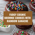 These Fudgy Cosmic Brownie Cookies combine the rich, intense flavor of dark cocoa with a soft and chewy brownie-like texture. Topped with luscious homemade chocolate ganache and colorful rainbow chip sprinkles, these cookies are perfect for celebrations or any time you crave a decadent treat. The cookies are baked to perfection so they remain slightly gooey in the center, enhancing their fudgy appeal.