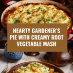 Gardener’s Pie with Root Vegetable Mash is a comforting vegetarian casserole featuring a hearty filling of sautéed vegetables and lentils, topped with a creamy mash made from potatoes and rutabaga. This dish combines earthy root flavors with fresh herbs and a rich but light texture, perfect for a wholesome and satisfying meal.