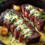 This garlic butter steak with Parmesan cream sauce combines rich flavors and a creamy finish for an impressive yet easy-to-make dinner. Perfectly seared ribeye steaks are topped with a luscious sauce that will delight any steak lover.