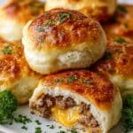 These Garlic Parmesan Cheeseburger Bombs are a delicious, savory appetizer or snack featuring a juicy ground beef and cheese filling wrapped in buttery biscuit dough, baked to golden perfection and topped with a garlic Parmesan butter glaze.