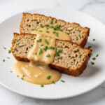 The image shows two thick slices of meatloaf placed side by side on a white plate. The outer layer of the meatloaf is browned and slightly crispy, while the inside is a light beige with small green herb pieces visible. A creamy, light brown gravy is generously poured over both slices, pooling slightly on the plate. Small green herb pieces are sprinkled on top and around the meatloaf, adding color contrast. The plate sits on a white marbled surface. Photo taken with an iphone --ar 4:5 --v 7
