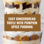 Keywords: gingerbread trifle, holiday dessert, layered pudding dessert, gingerbread cake, pumpkin spice pudding, white chocolate pudding