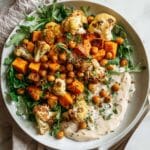 A vibrant and nourishing Glow Bowl featuring oven-roasted cauliflower, carrots, sweet potatoes, and crispy chickpeas, paired with a creamy tahini yogurt sauce. This wholesome bowl is perfect for a healthy lunch or dinner, delivering bold flavors and a satisfying texture that’s both colorful and delicious.