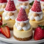 These adorable Gnome Mini Cheesecakes are a festive holiday treat featuring a buttery graham cracker crust, creamy cheesecake filling, and cute strawberry gnome hats topped with whipped cream and candy noses. Perfect for holiday parties or a whimsical dessert, each mini cheesecake is individually baked in a muffin tin and decorated to resemble little gnome characters.