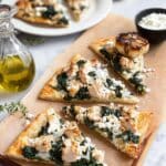 Keywords: Greek flatbread, homemade tzatziki, Mediterranean chicken, flatbread dough, roasted garlic, sautéed spinach, feta cheese, marinated chicken