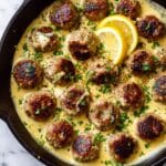 These Greek Chicken Meatballs in Lemon Cream Sauce combine tender, flavorful chicken meatballs with a rich and tangy lemon cream sauce, enhanced by garlic, feta, olives, and herbs. Perfectly seared for a golden crust and simmered in a luscious sauce, this dish offers a delightful balance of Mediterranean-inspired flavors, served best alongside orzo, rice, or quinoa for a comforting and elegant meal.