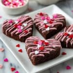 The image shows four heart-shaped chocolate brownies on a white square plate, each decorated with pink icing drizzled in thin stripes across the top layer. On top of the icing, small heart-shaped sprinkles in red, pink, and white add color and texture. The brownies have a dense and moist look with a dark brown color, and the plate is scattered with the same colorful heart sprinkles around the brownies. The background shows a bowl with more sprinkles, and the surface is a white marbled texture. photo taken with an iphone --ar 4:5 --v 7