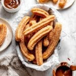 This homemade churros recipe features crispy, golden fried dough sticks rolled in a fragrant cinnamon-sugar mixture. With a buttery, vanilla and cinnamon-spiked dough that’s easy to pipe and fry, these churros make a delightful dessert or snack reminiscent of classic Spanish and Mexican street food.