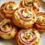 Hot Ham and Cheese Pinwheels make for a delicious and elegant appetizer or snack. These flaky puff pastry spirals are packed with savory ham, sharp cheddar, and Swiss cheese, seasoned for extra flavor. Perfect for parties or a cozy treat, they’re easy to prepare and always a crowd-pleaser.