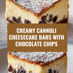 These Irresistible Cannoli Cheesecake Bars blend the creamy richness of classic cheesecake with the delightful texture of ricotta and mini chocolate chips, all atop a buttery graham cracker crust. Baked to perfection and dusted with powdered sugar, these bars offer an elegant yet easy-to-make dessert that captures the beloved flavors of cannoli in every bite.
