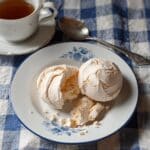 Two light beige meringue cookies with a rough, airy texture sit on a white plate with a thin blue rim and delicate blue floral pattern in the center. One meringue is whole, the other slightly cracked with small crumbs around it. The plate rests on a blue and white checkered cloth. A white cup with dark tea and a silver spoon are placed near the plate on the cloth. Photo taken with an iphone --ar 4:5 --v 7