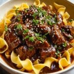 Korean Beef Noodles is a hearty and flavorful dish featuring tender beef chunks slow-cooked in a savory and slightly spicy broth infused with ginger, garlic, soy sauce, and gochujang. Served over soft noodles and garnished with fresh green onions, sesame seeds, and cilantro, this comforting meal combines rich Korean flavors with comforting noodle warmth, perfect for an easy dinner.