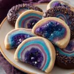 Magical Spiral Cookies are visually stunning and deliciously buttery cookies featuring vibrant purple, black, and white spiraled doughs. These cookies combine a classic buttery sugar cookie base with delightful almond and vanilla extracts, baked to golden perfection and decorated with sprinkles for a magical touch. Perfect for festive occasions or a fun baking project, these cookies are as charming to look at as they are to eat.