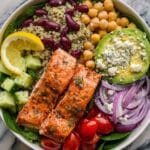 A refreshing and flavorful Mediterranean Salmon Bowl featuring tender oven-baked salmon marinated in a zesty herb and lemon marinade, served over quinoa and mixed greens with a vibrant vegetable salad, creamy tzatziki sauce, feta cheese, olives, and avocado. This wholesome bowl is perfect for a nutritious lunch or dinner with a delightful balance of textures and Mediterranean flavors.