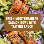 Keywords: Mediterranean salmon bowl, baked salmon, healthy salmon recipe, quinoa bowl, tzatziki sauce, easy salmon dinner, nutritious Mediterranean food