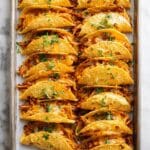 Crispy mini chicken tacos made with shredded seasoned chicken breast, melted colby jack cheese, and corn tortillas baked to perfection. These bite-sized tacos are a delicious and easy snack or appetizer, served with fresh cilantro, salsa, and sour cream for added flavor.
