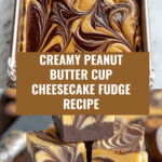 This Peanut Butter Cup Cheesecake Fudge is a decadent treat combining rich chocolate, creamy peanut butter, and smooth cheesecake flavors. Perfect for satisfying your sweet tooth, this fudge offers layers of indulgence with a delightful swirl pattern.