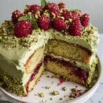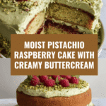 Keywords: Pistachio cake, raspberry cake, layered cake, pistachio buttercream, fresh raspberry dessert, nutty cake, elegant tea cake