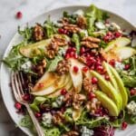 A vibrant and crunchy Pomegranate Salad featuring toasted walnuts and pumpkin seeds coated in honey and chipotle, mixed with fresh greens, apples, avocados, and tangy pomegranate seeds, all dressed in a luscious honey mustard dressing with fig preserves and orange zest. Perfect for a refreshing and colorful starter or light main dish.