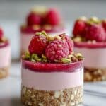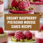These Raspberry Pistachio Mousse Cakes are elegant, layered desserts featuring a crunchy pistachio-almond base, a creamy pistachio mousse, vibrant raspberry compote, and a silky raspberry mousse topping. Perfect for special occasions, they combine nutty flavors with tangy fruit in a light, airy texture.