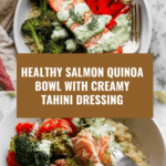 - Assemble Bowls: Divide the cooked quinoa between two bowls. Top each with roasted vegetables and a piece of baked salmon. Drizzle generously with the tahini dressing and serve immediately. Enjoy your nutritious and flavorful meal!