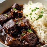 Savory Filipino Beef Adobo is a classic braised dish featuring tender short ribs simmered in a rich, tangy, and umami-packed sauce made with soy sauce, vinegar, garlic, and aromatic spices. Slow-cooked to perfection in the oven, this comforting meal delivers deep flavors with a perfect balance of savory, sweet, and acidic notes, ideal for serving over fragrant Jasmine rice.